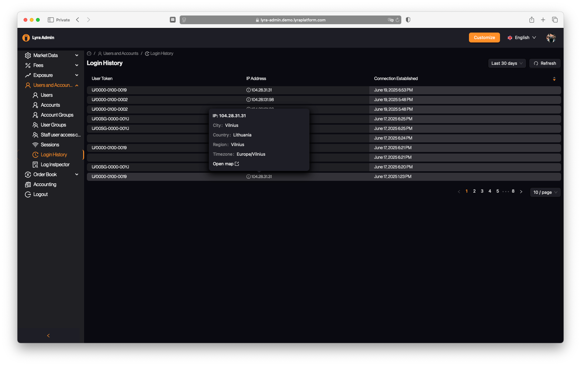 - Track logins and active sessions with full audit trails, timestamps, IPs, and location data.