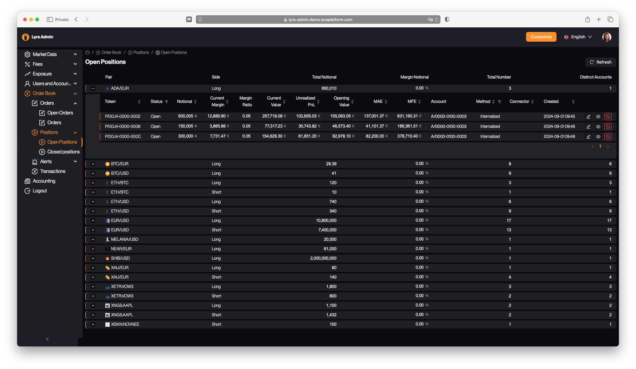 Exposure dashboards, manual overrides, risk routing rules, margin enforcement, fee definition, and instrument logic—all in one place. The Lyra Operations Portal brings unified control to front- and middle-office functions, updated in real time and reflected instantly across the OMS and trading interface.